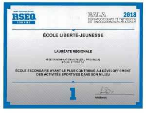 Le 16 mai dernier avait lieu le Gala régional d’excellence du sport étudiant RSEQ Laurentides Lanaudière. Parmi 67 écoles de la région, l’École secondaire Liberté-Jeunesse est fière d’avoir reçu le prix de « L’École secondaire ayant le plus contribué au développement des activités sportives dans son milieu ». BRAVO ESLJ !